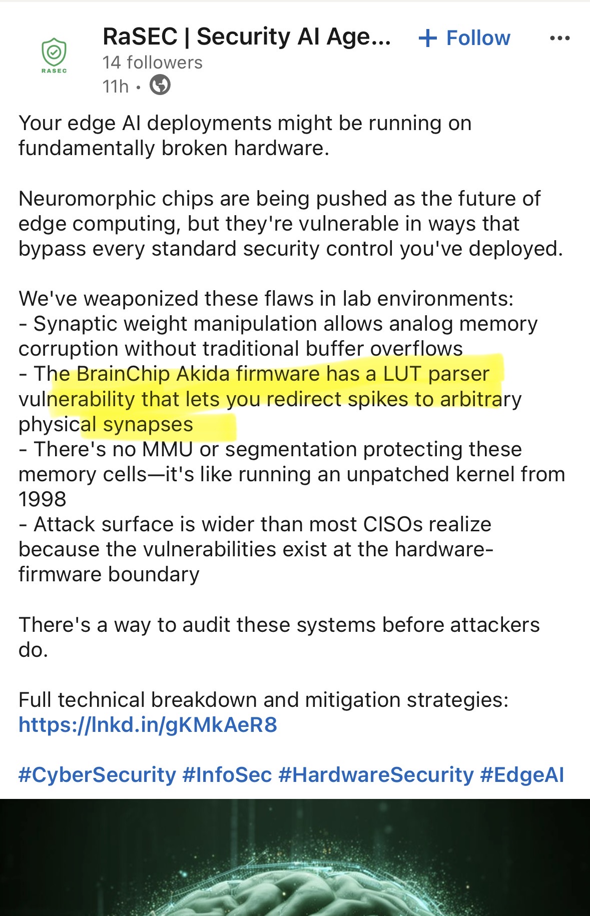 However, we know that Akida can implement cybersecurity functions, so a small model directed to the alleged chink may be able to ameliorate the danger - wouldn't that be something - a self-immunizing MRNA vaccine capability.