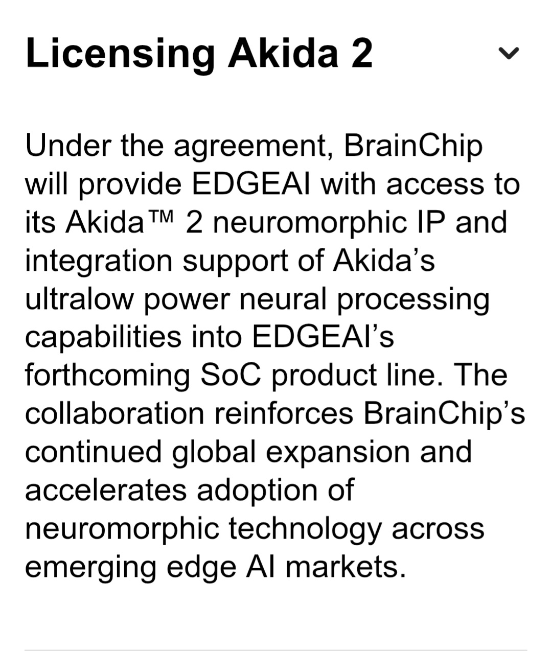 Given that the announcement refers to integration into EDGEAI’s forthcoming SoC product line, it may be that they are planning to incorporate Akida 2 into a future generation of their products.
