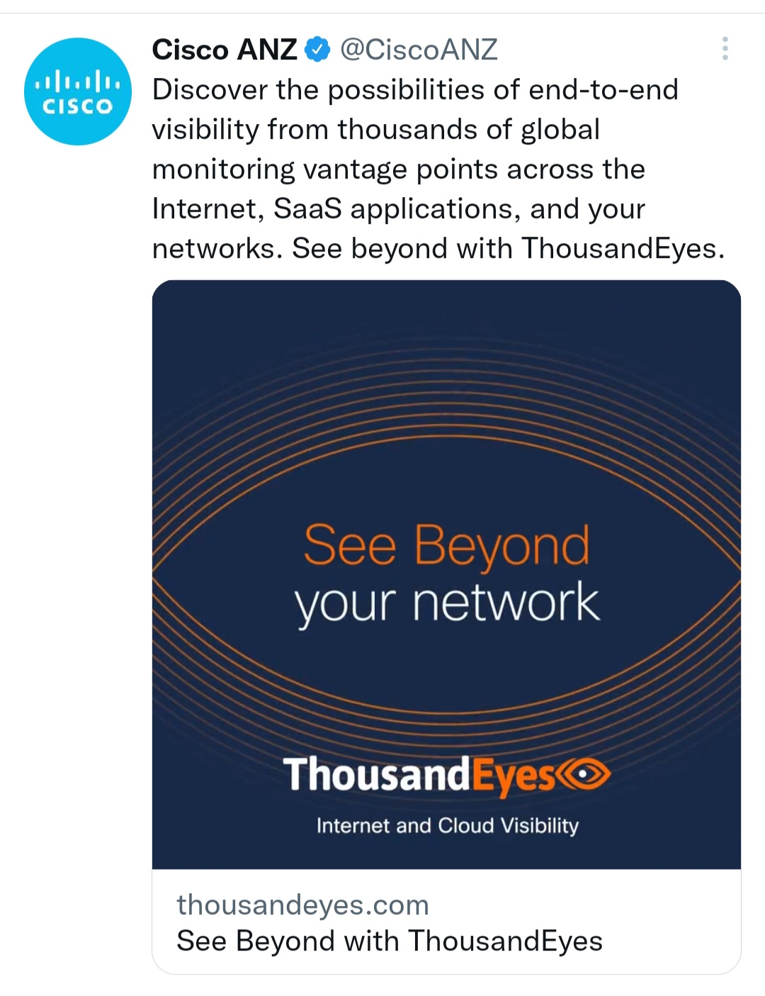 I would love there to be a connection to "A Major Telecommunications Company" as mentioned recently, though from the website it says 1000eyes was founded in 2010. A bit before the phrase was used here unfortunately.Nearly spat out my tea. Lol. Fact Finder ... are Cisco testing us to see if the "thousand eyes" pick this up?