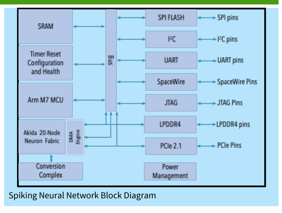 The goal of this project is the creation of a radiation-hardened Spiking Neural Network (SNN) SoC based on the BrainChip Akida Neuron Fabric IP. Akida is a member of a small set of existing SNN architectures structured to more closely emulate computation in a human brain. The rationale for using a Spiking Neural Network (SNN) for Edge AI Computing is because of its efficiencies. The neurmorphic approach used in the Akida architecture takes fewer MACs per operation since it creates and uses sparsity of both weights and activation by its event-based model. In addition, Akida reduces memory consumption by quantizing and compressing network parameters. This also helps to reduce power consumption and die size while maintaining performance.
