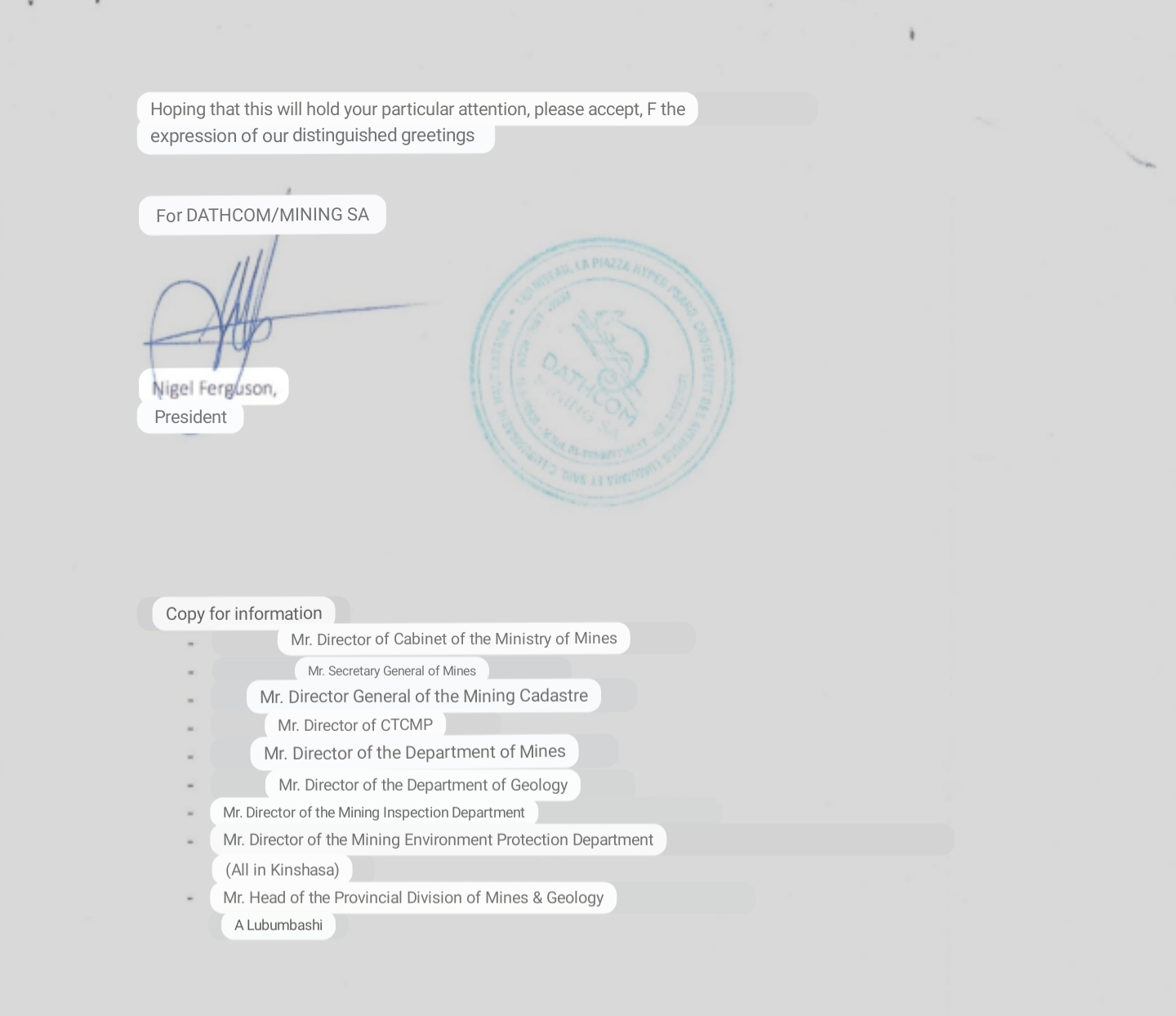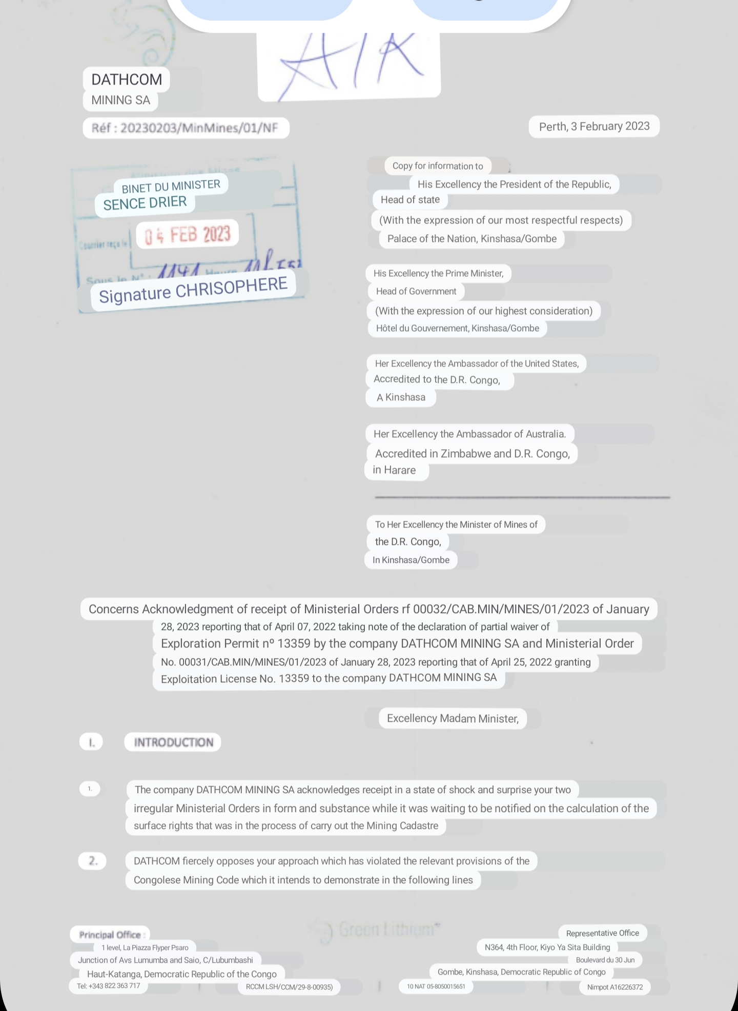 "To Her Excellency the Minister of Mines of the D.R. Congo in Kinshasa/Gombe