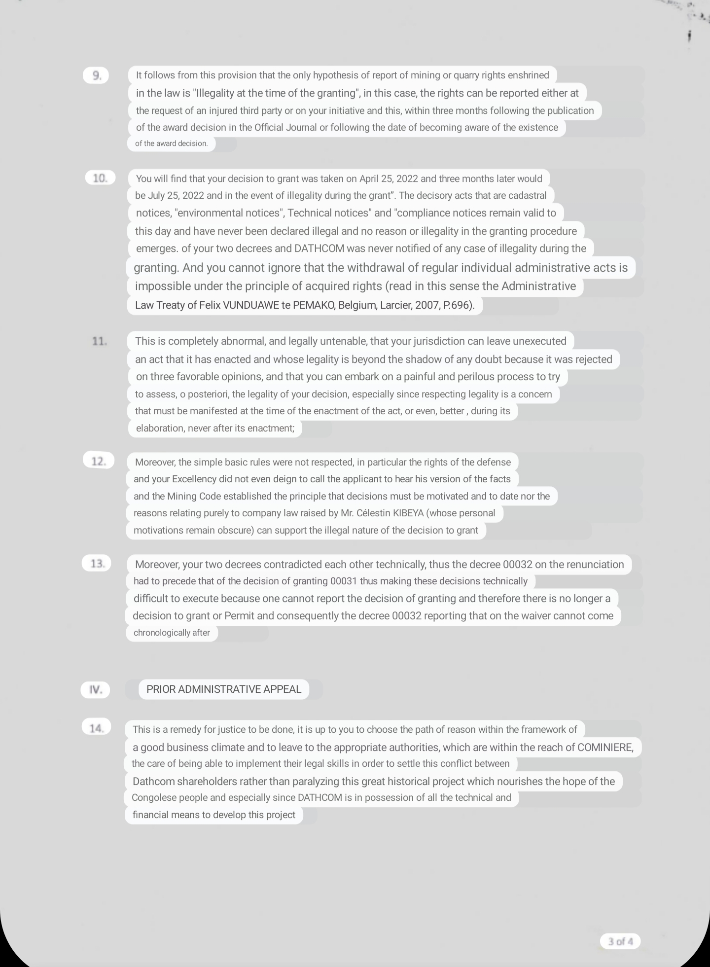 Moreover, the simple basic rules were not respected, in particular the nights of the defense and your Excellency did not even decide to call the applicant to hear his version of the facts and the Mining Code established the principle that decisions must be motivated and to date none of the reasons relating purely to company law raised by Mr. Celestin KIBEYA (whose personal motivations remain obscure) can support the illegal nature of the decision to grant."