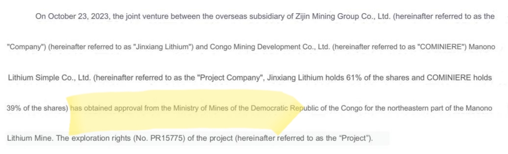 'According to the joint venture agreement signed by Jinxiang Lithium and COMINIERE, after the Project Company acquires the exploration rights numbered PR15775, COMINIERE agrees to directly deduct the purchase price of USD 33.44 million for the 15% equity in Dathcom from the amount payable by Jinxiang Lithium to obtain a 61% equity interest in the Project Company.'