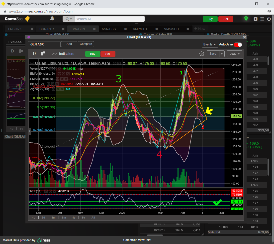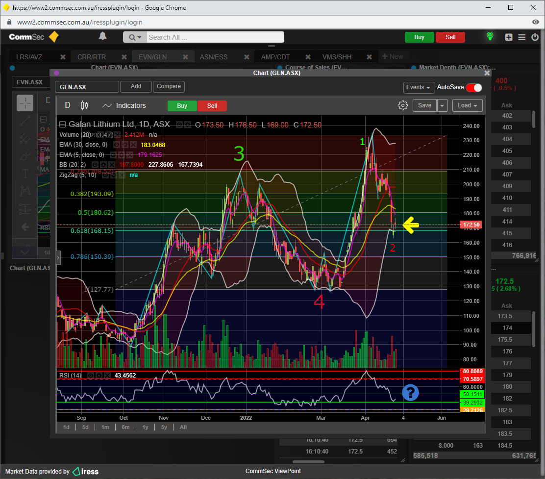 Just like all other lithium coy, GLN got smashed from the MACRO fallout, i am looking to see SP stabilise before any top ups, if current support doesnt hold, i would be confident that the 78 fib support will hold, RSI 14 is slightly under 50, which is perfectly placed for a run, a break of 50 fib resistance to the upside would confirm the sub wave 3up swing.