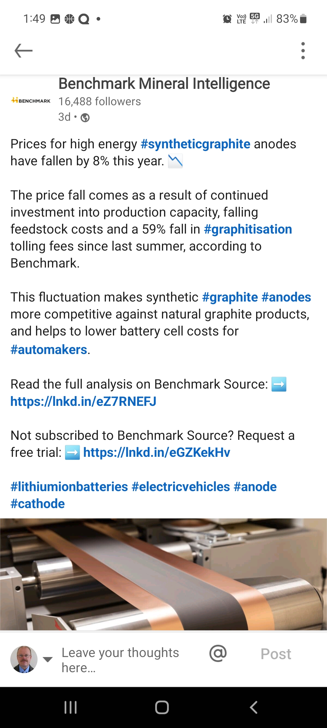 Georgi Georgiev said. “Since then, graphitization costs have fallen by almost 50% and uSPG prices have followed, dropping by more than 28%.”