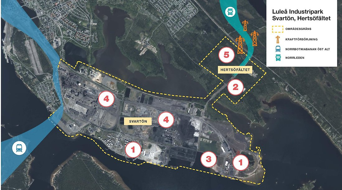 Here is a map of the planned establishments on Hertsöfältet and Svartön, both of which are part of the Luleå Industripark project.
