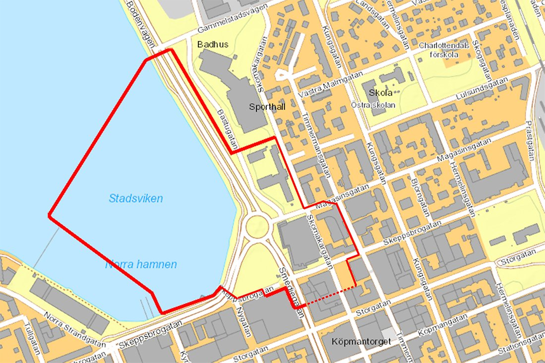 "Parts of central Luleå will be closed from 29-31 May. The map with red markings shows an approximate picture of which areas are affected. (Image: Police Agency)