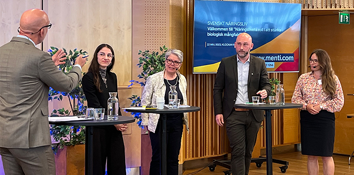 Participated in the Swedish Business Association's panel discussion on biological diversity (from v). Robert Thorburn, moderator, Swedish business, Romina Pourmokhtari (L), climate and environment minister, Margareta Renström Linde, expert Biodiversity and Business WWF, John Tumpane, department head environment Formas and Sara Carlsén, coordinator for biodiversity Boliden.