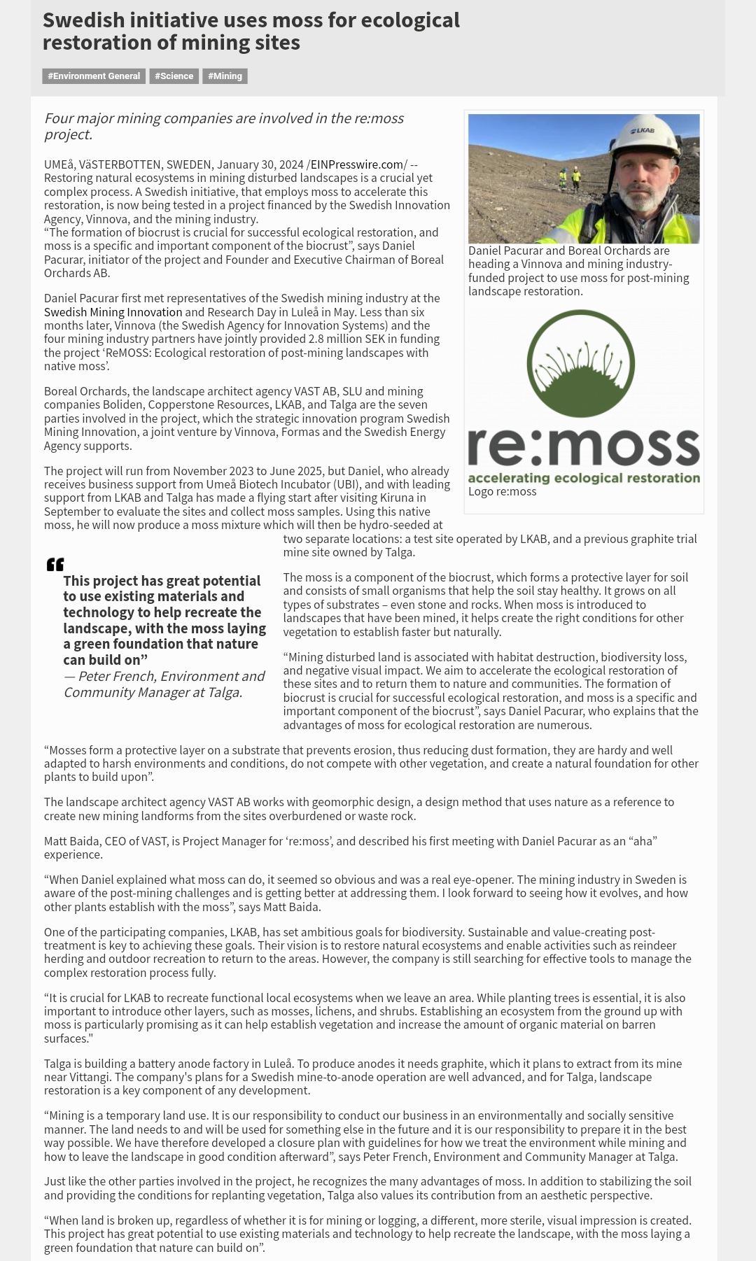 * Daniel Pacurar and Boreal Orchards AB lead a project, financed by Vinnova and the mining industry, to use moss in landscape restoration after mining.