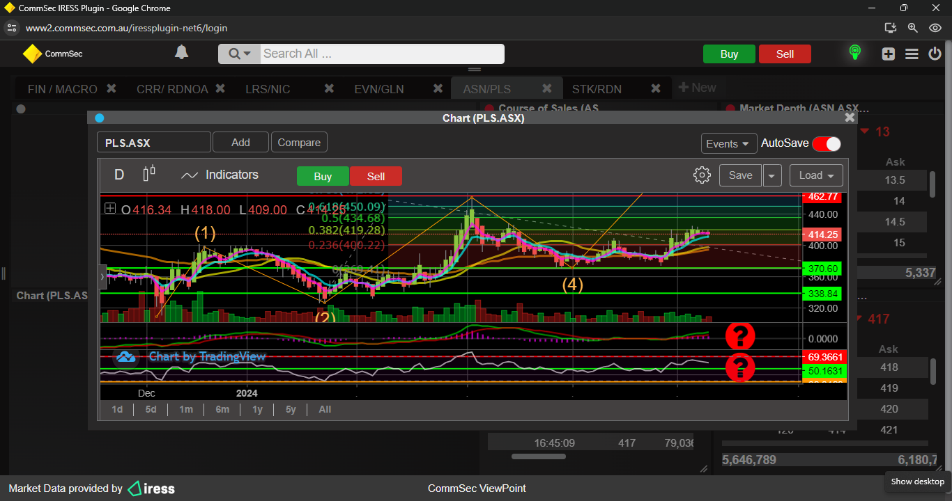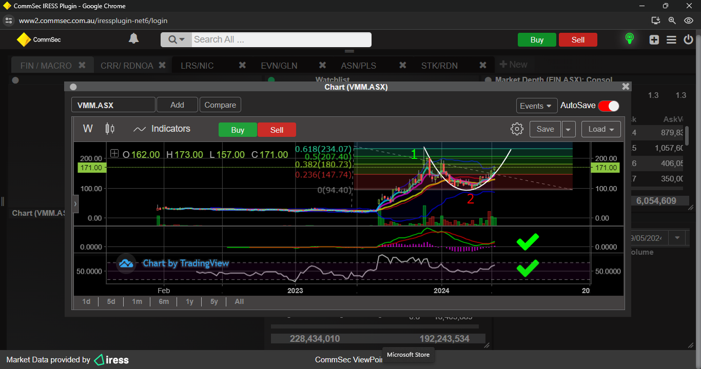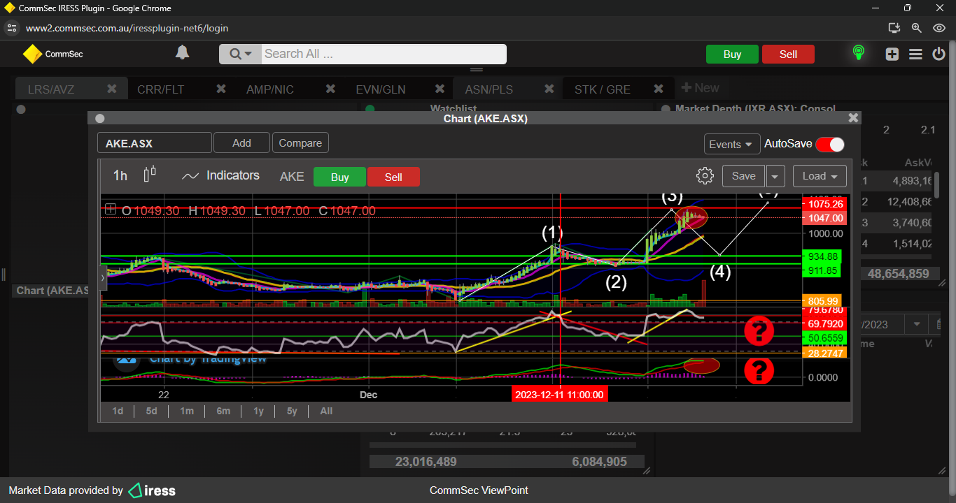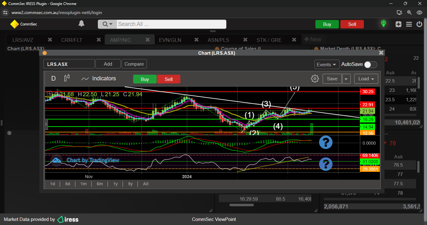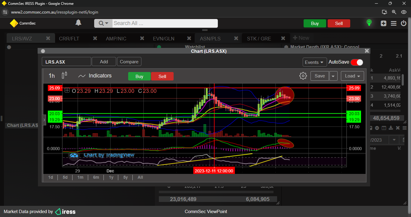 Last week i mentioned LRS was OB on the hourly chart, could drop back to 20c support, well i was on the money, 11/12/23 it made its descent, ended up bottoming at 19.3, then has made a nice move to challenge 25c resistance, but indicators are looking a bit iffy, so a minor push back to 19/20c support could be on the cards.
