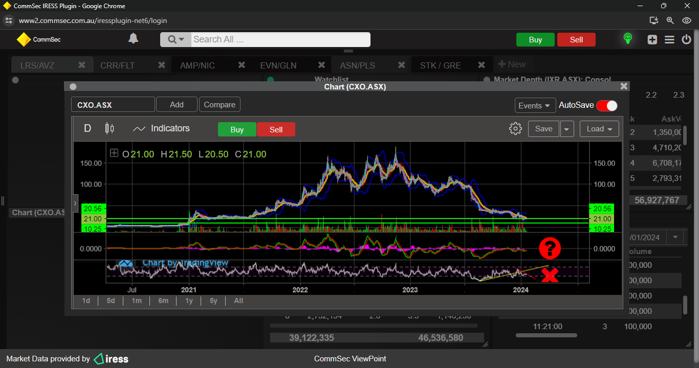 With CXO on C&M, its really at the whim of markets where the SP goes, if 21c strong support doesnt hold, then 10c support comes to play. RSI 14 is not over sold, so there is a high possibility it could reach that low. Its a flip of the coin where this goes. For long term holders , just put it in the back draw, but if you are a trader, apply a tight SL .