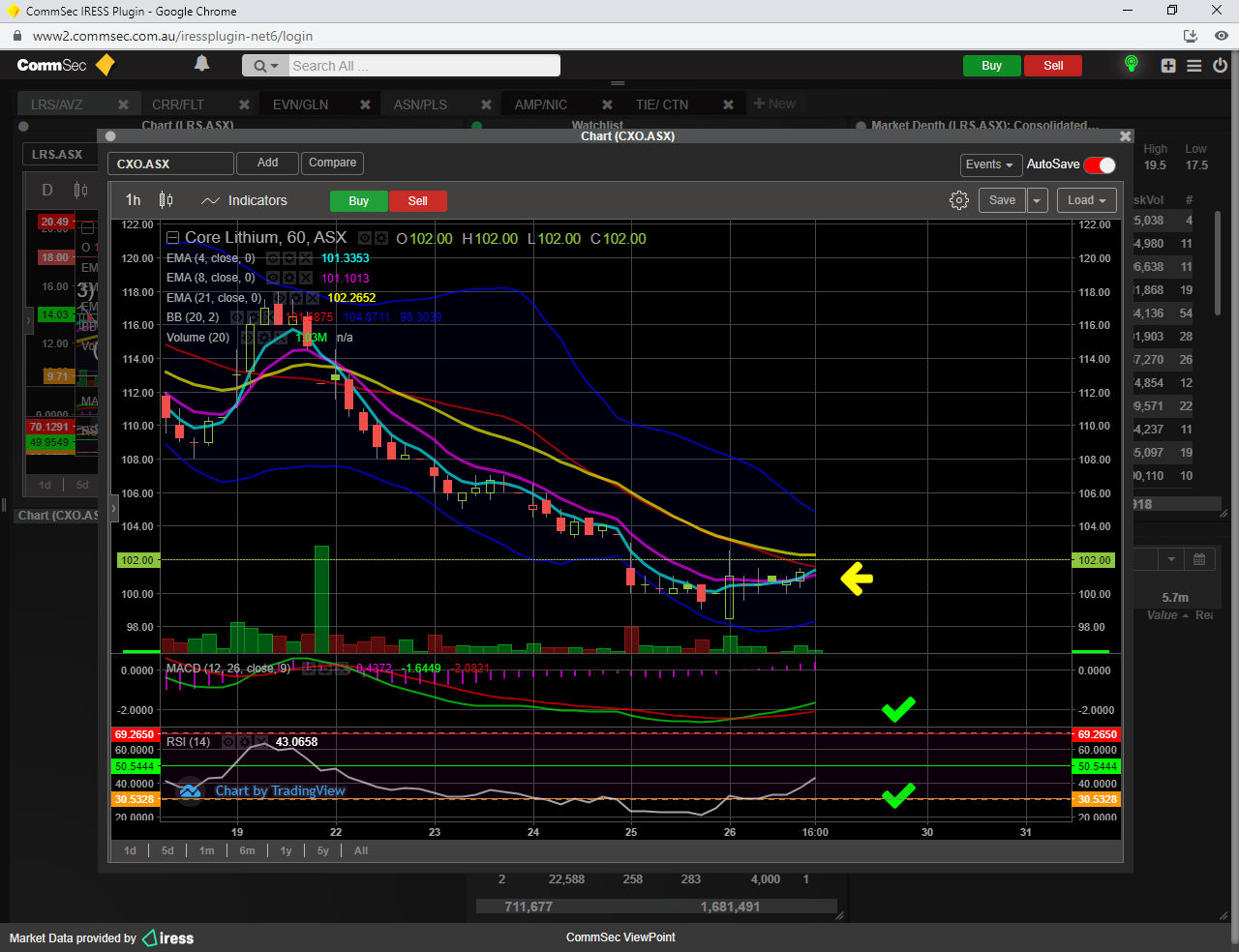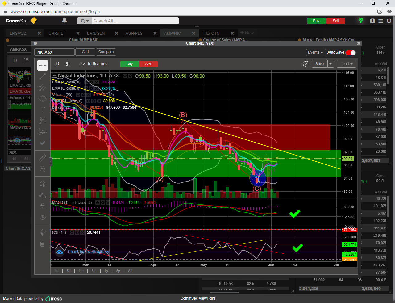 b) RSI 14 has come off oversold 29 nicely, and now primed for a clear break of the important 50 line.